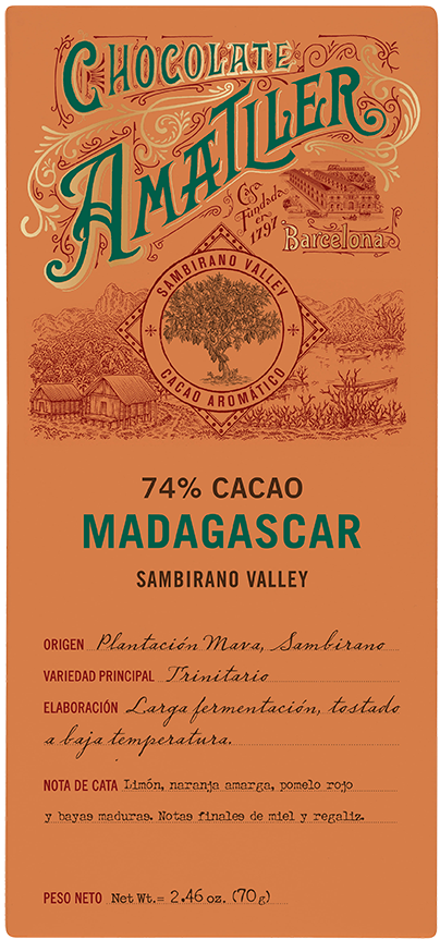 Hořká čokoláda Madagascar 74%. Chuťové tóny: citrón, hořký pomeranč, červený grapefruit a zralé bobule, v závěru: med a lékořice.
