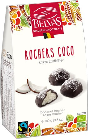 BIO amp; Fairtrade ručně vyráběné pralinky z hořké čokolády s čerstvým kokosem ze Srí Lanky. BEZ LEPKU, bez alkoholu.