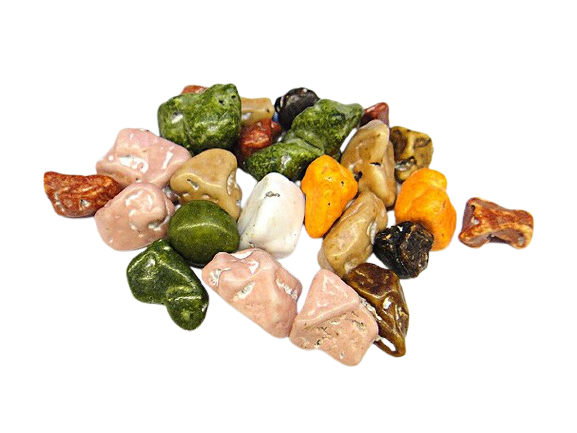 Malé kamienky z mliečnej čokolády v farebné kruste.