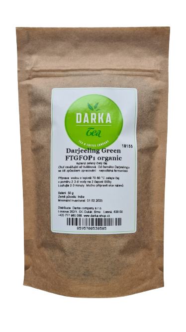Originálny zelený sypaný čaj najvyššej kvality (FTGFOP1). Čaj Darjeeling je veľmi známy Indický čaj pestovaný v kopcovitých oblastiach. Má kvetinovú, muškátovú chuť. Od čierneho Darjeelingu sa líši spôsobom spracovania - nie je fermentovaný.