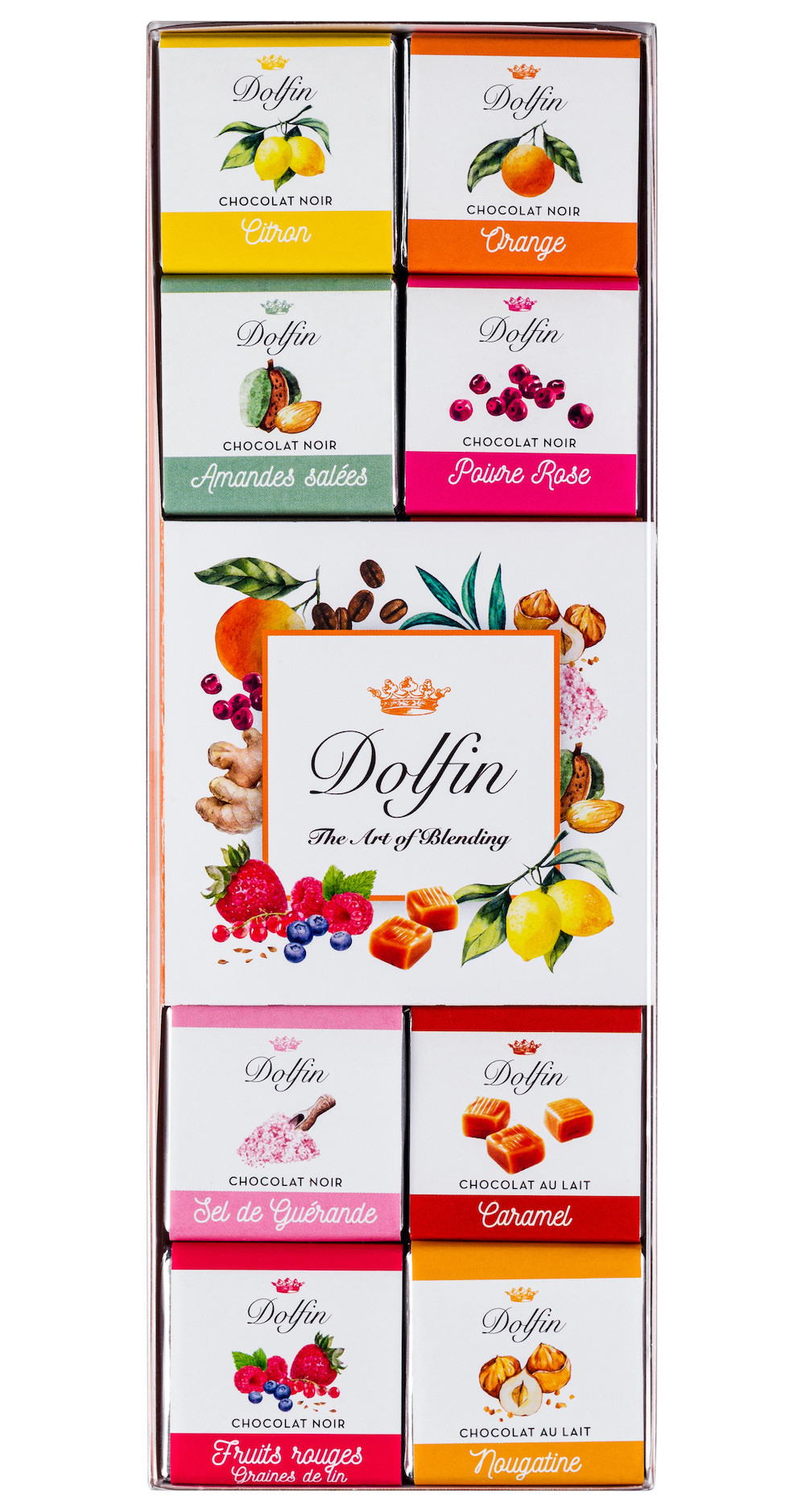 Mléčná čokoláda s kávou / Mléčná čokoláda s karamelem / Mléčná čokoláda s nugátem / Hořká čokoláda s guérandskou solí / Hořká čokoláda se zázvorem / Hořká čokoláda s růžovým pepřem / Hořká čokoláda s citrónem / Hořká čokoláda s pomerančem / Hořká čokoláda se solenými mandlemi / Hořká čokoláda s čajem Earl Grey / Hořká čokoláda s nugátem / Hořká čokoláda s červeným ovocem a lněným semínkem