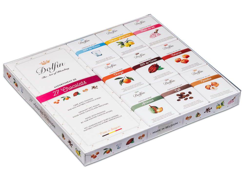 Plná paleta barev a exploze chutí vytváří perfektní dárek nebo okamžik pro sdílení… Sortiment 27 tabulek hořké a mléčné čokolády složený z 9 různých příchutí: