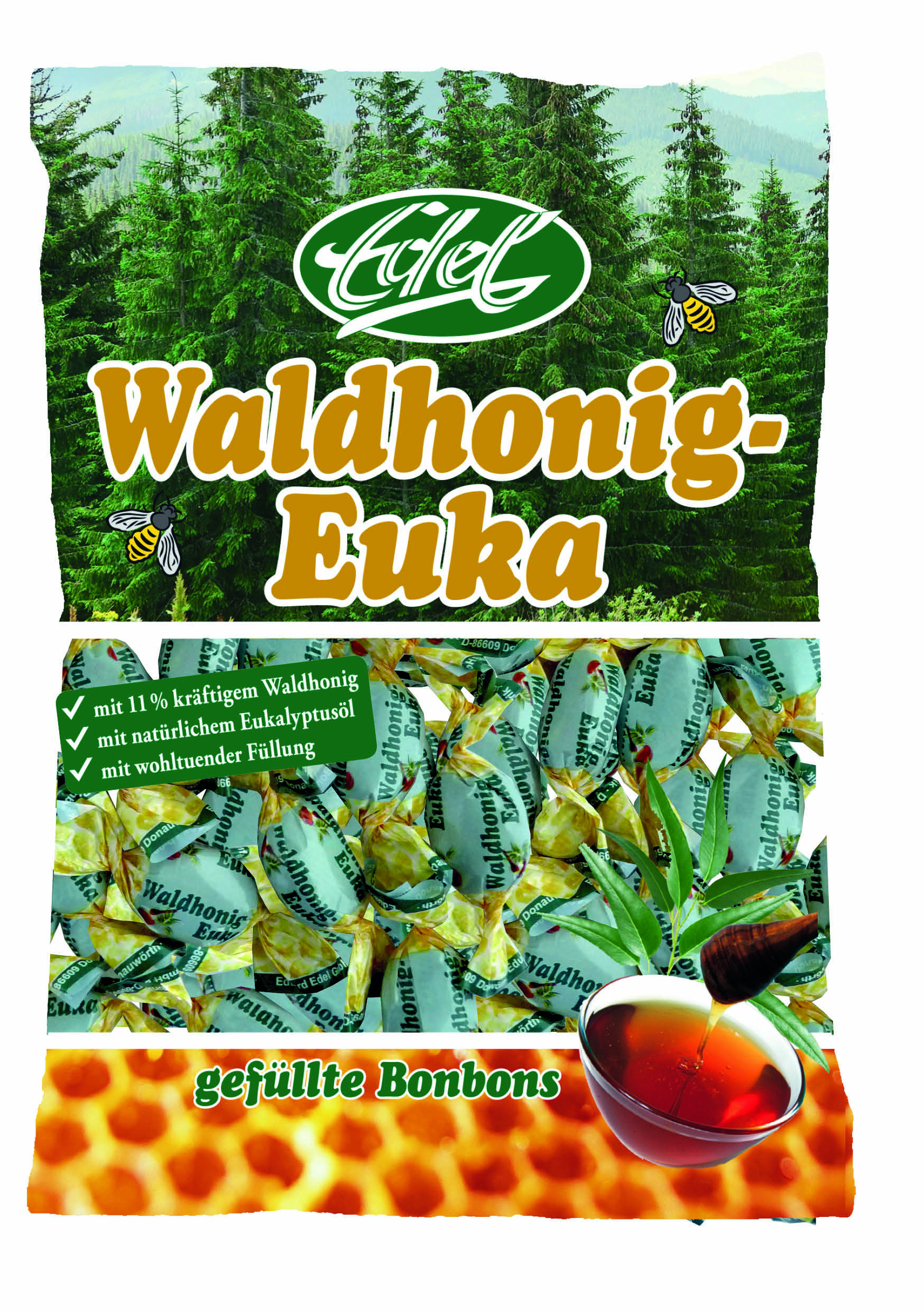 Složení: glukózový sirup, cukr, lesní med (11 %), přírodní aroma (eukalyptový olej, mentol).
