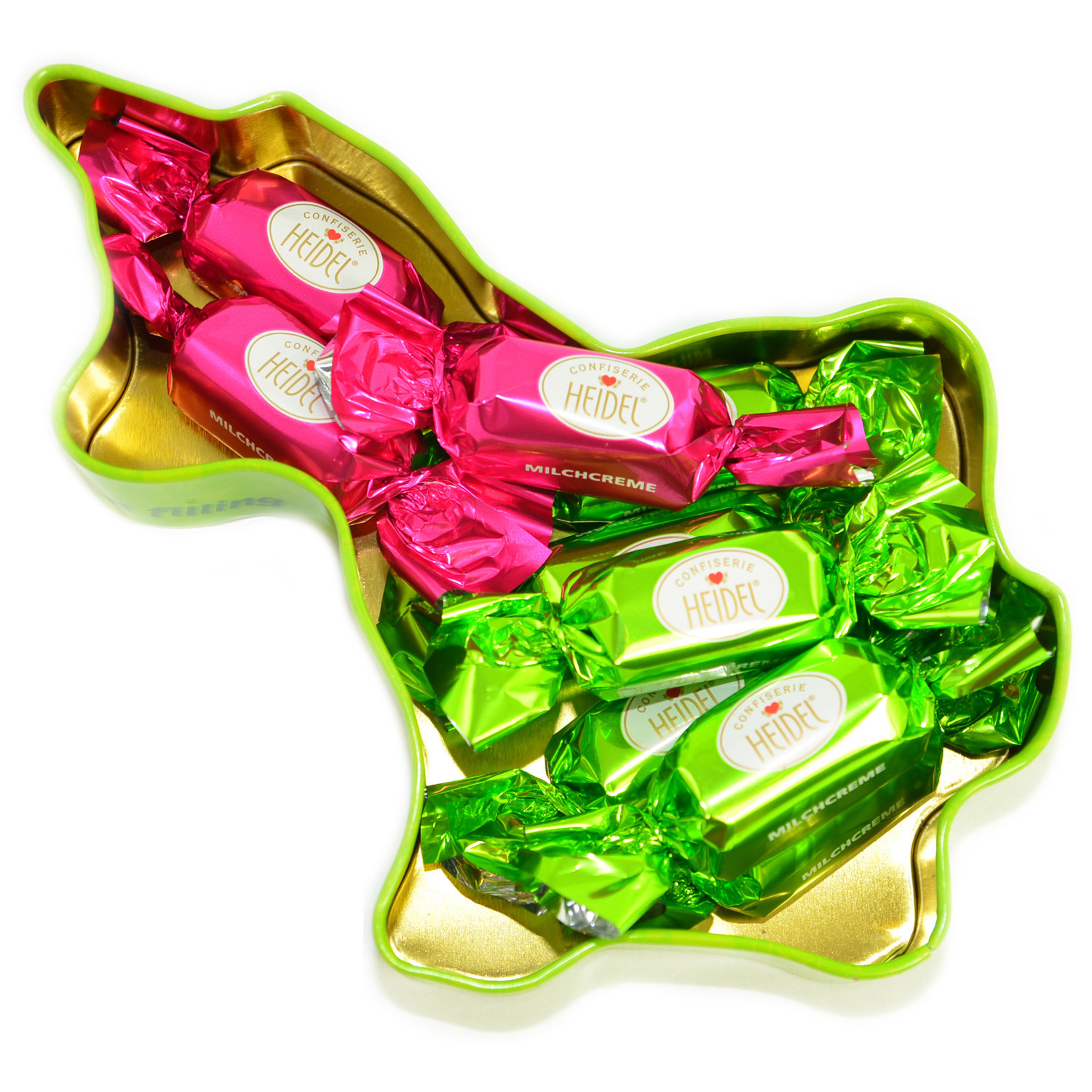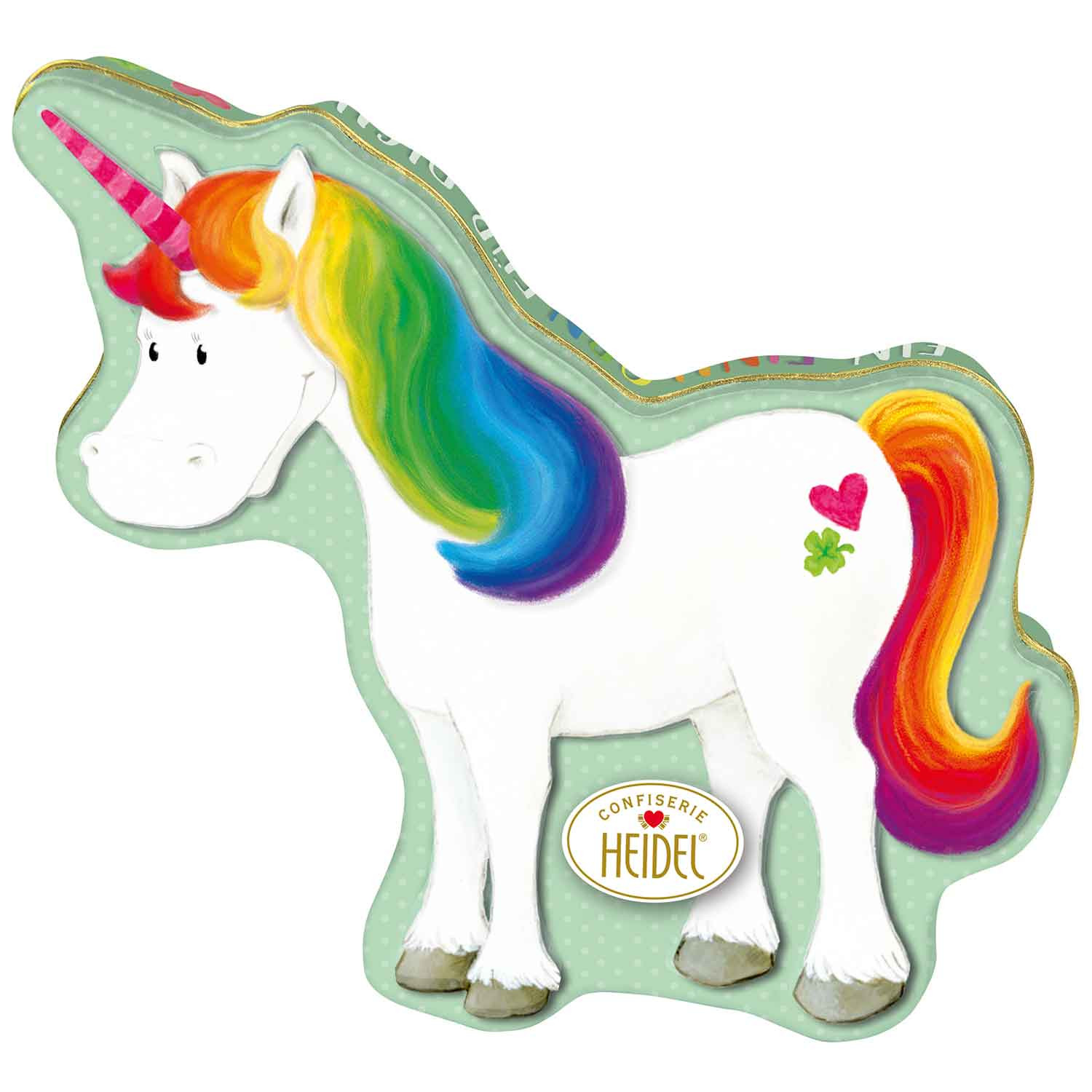 Jednorožec - reliéfní kovová dóza v designu jednorožce s jednotlivě balenými pralinkami z mléčné čokolády s mléčnou krémovou náplní (36 %).