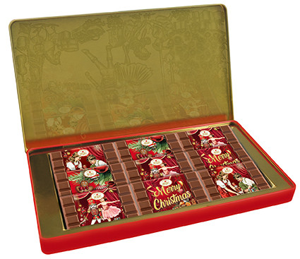 Mini tabulky jemné mléčné čokolády (minimální podíl kakaové sušiny 37 %) v dárkové kovové kazetě s vánočním motivem .