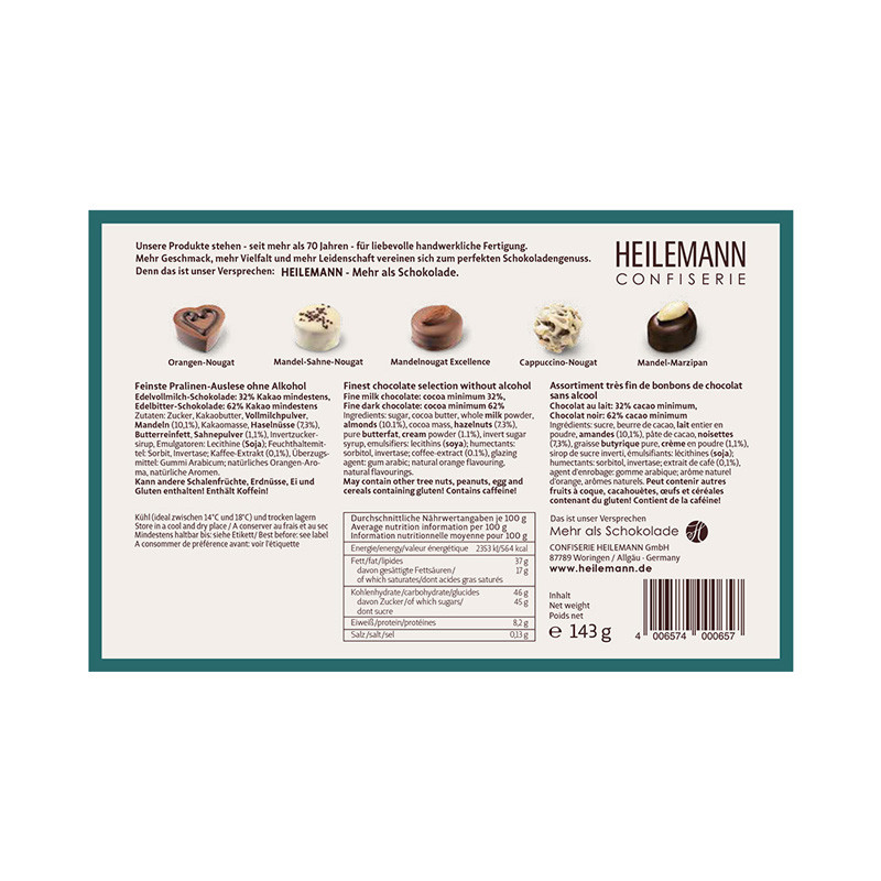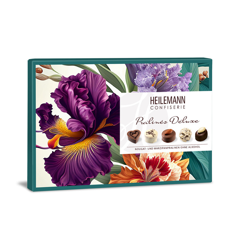 Heilemann Pralinés Deluxe – nugátové a marcipánové pralinky. Objevte naše nové pralinkové kompozice – pastva pro smysly! Nebeské sny o nugátu a lanýži: jemné náplně pokryté křupavou čokoládou – harmonický chuťový zážitek, který svádí. Živý květinový design odráží svěžest vůní a přitahuje pozornost každého. Ideální dárek pro zvláštní příležitosti. Dopřejte sobě nebo svým blízkým tyto vynikající čokolády: pomerančové nugátové, pralinky mandlovo-smetanovo-nugátové, Mandlový nugát Excellence, nugát cappuccino, nugátové pralinky, mandlové marcipánové pralinky. Tento výběr nugátových a marcipánových pralinek je bez alkoholu!