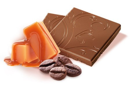 Jemná mléčná čokoláda s karamelem a kousky kávy.