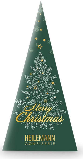 Heilemann vánoční strom "Veselé Vánoce" s nugátovými kuličkami. Jemná plnotučná mléčná čokoláda s lísko oříškovou nugátovou náplní a jemná čokoláda s kořeněnou nugátovou náplní. Minimální podíl kakaové sušiny v mléčné čokoládě: 32 %. Toto originální dárkové balení naplněné nugátovými kuličkami ve tvaru vánočního stromku je skvělým dárkem pro všechny velké i malé mlsouny . Kuličky potažené tou nejjemnější mléčnou čokoládou a plněné krémovým oříškovým nugátovým jádrem jsou speciálním chuťovým zážitkem, který dostane každého fajnšmekra! Krabička "Merry Christmas" obsahuje šest kuliček Heilemann Nougat plněných jemným lísko oříškovým nugátem a nugátem koření, každá po 15 g.
