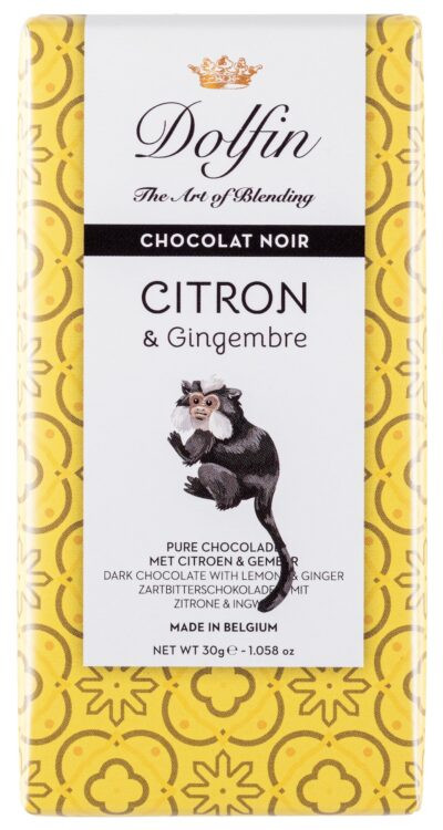 Složení: kakaová hmota, cukr, kakaové máslo, citrón 2,5 %, zázvor 1 %, emulgátor: SÓJOVÝ lecitin, přírodní vanilkové aroma. Minimální podíl kakaové sušiny: 60 %.