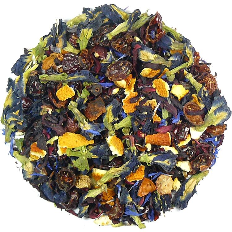 Zloženie: Rooibos červený, pomarančová kôra, Klitoria ternatea, Ibištek kvet 10%, Nevädza kvet, ruža, prírodná aróma