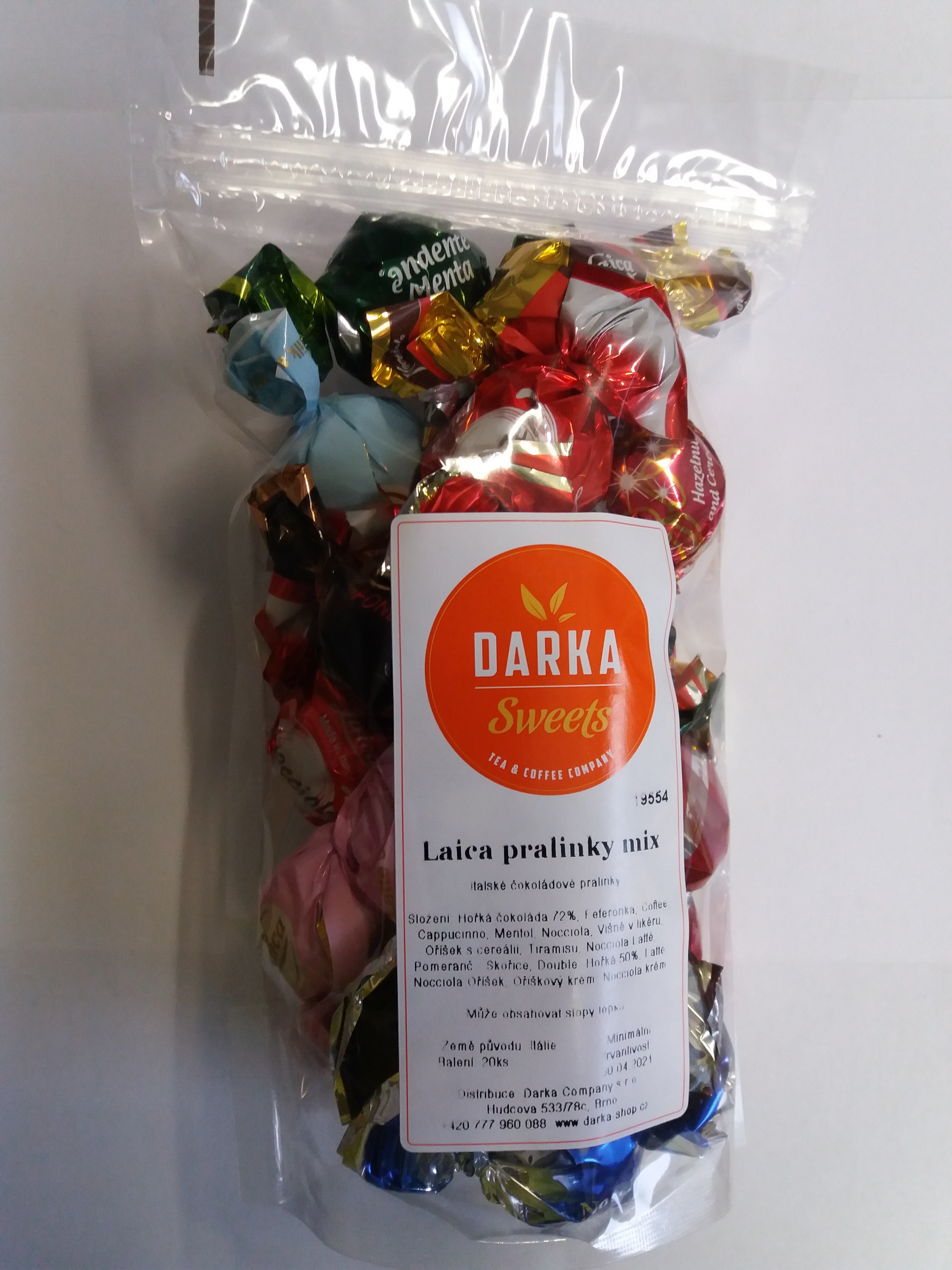 Zloženie: horká čokoláda 72%, Feferónka, Coffee, Cappuccino, Mentol, Nocciola, Višne v likéru, Tiramisu, Horká - 50%, Orieškový krém, Nocciola krém.
