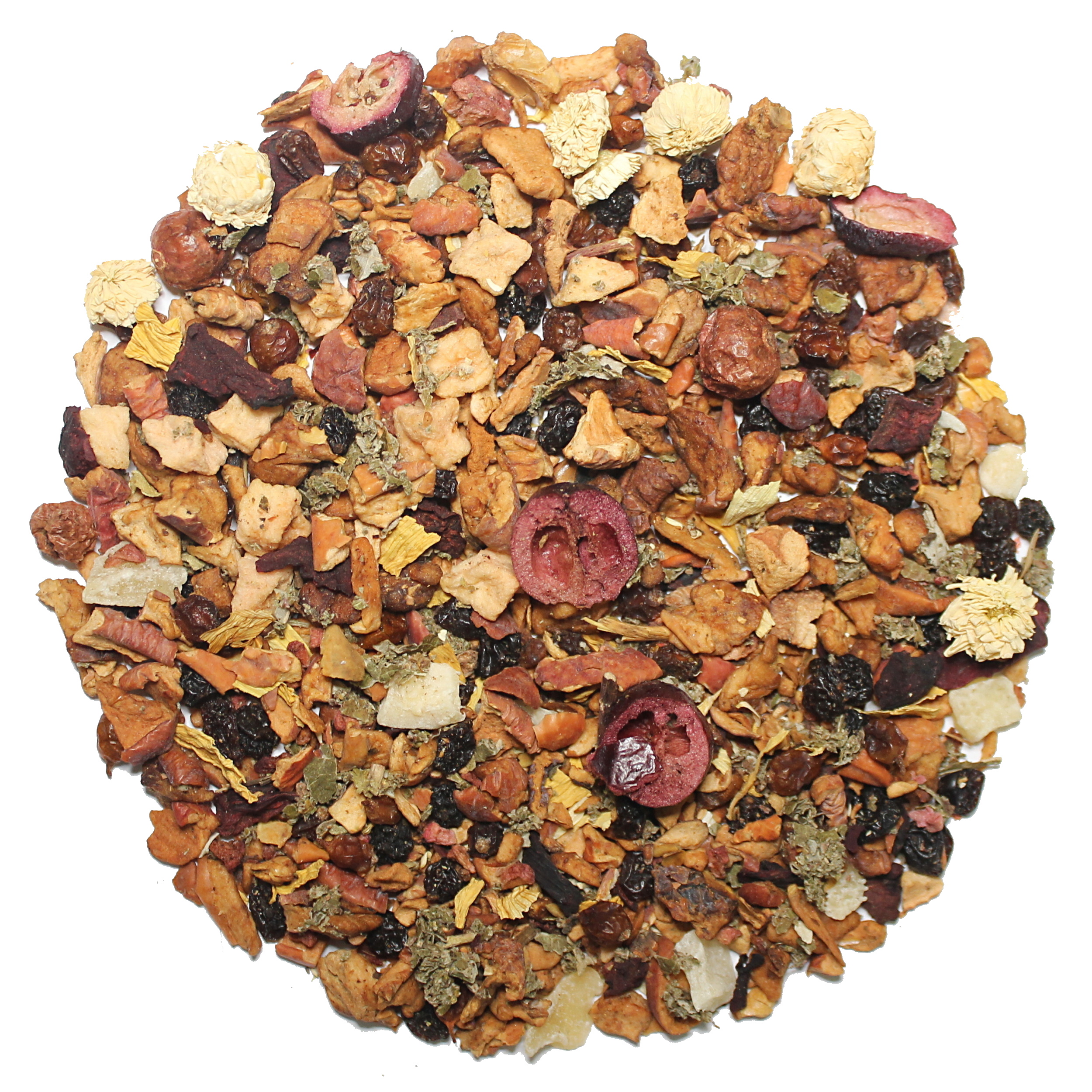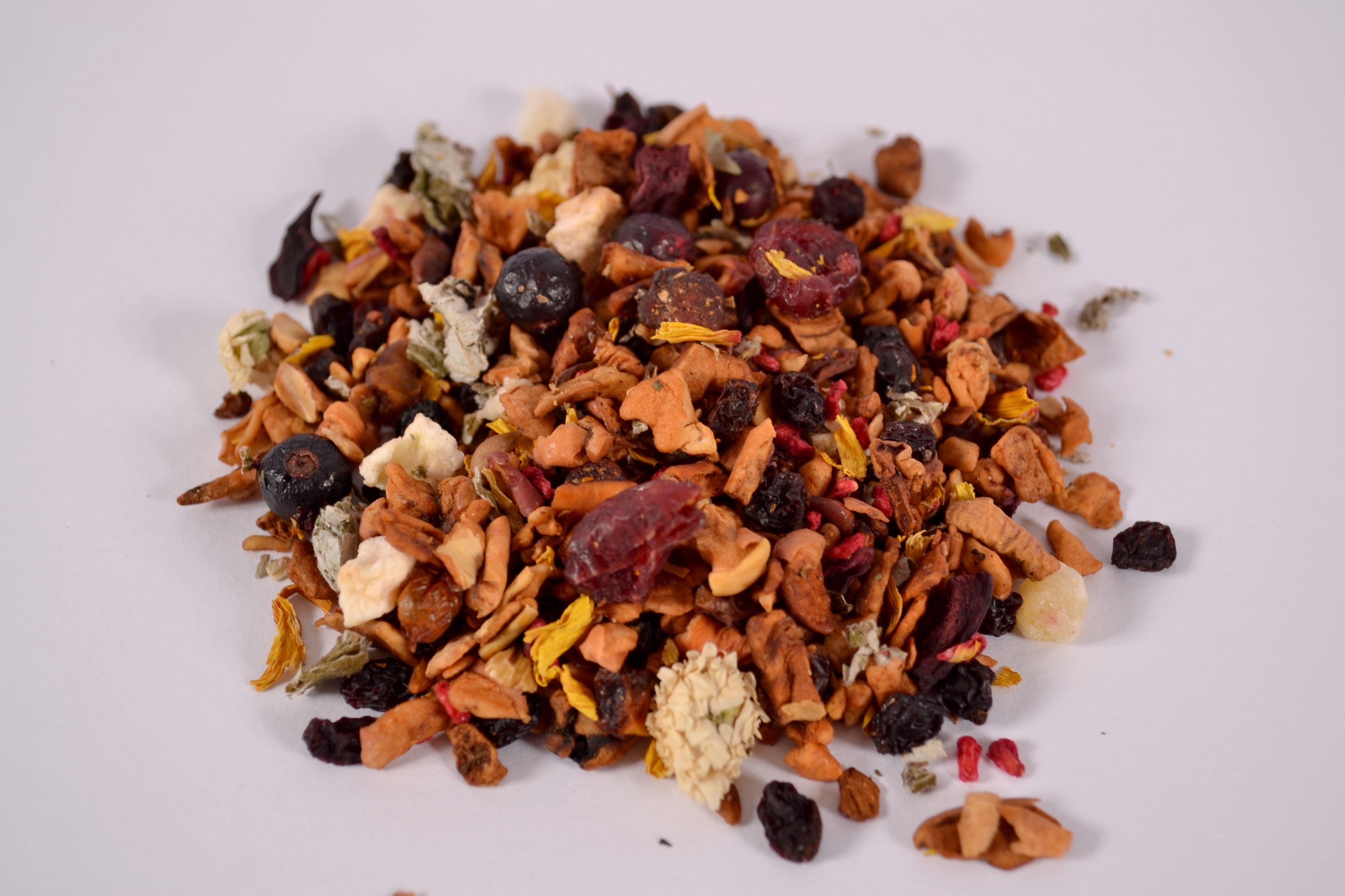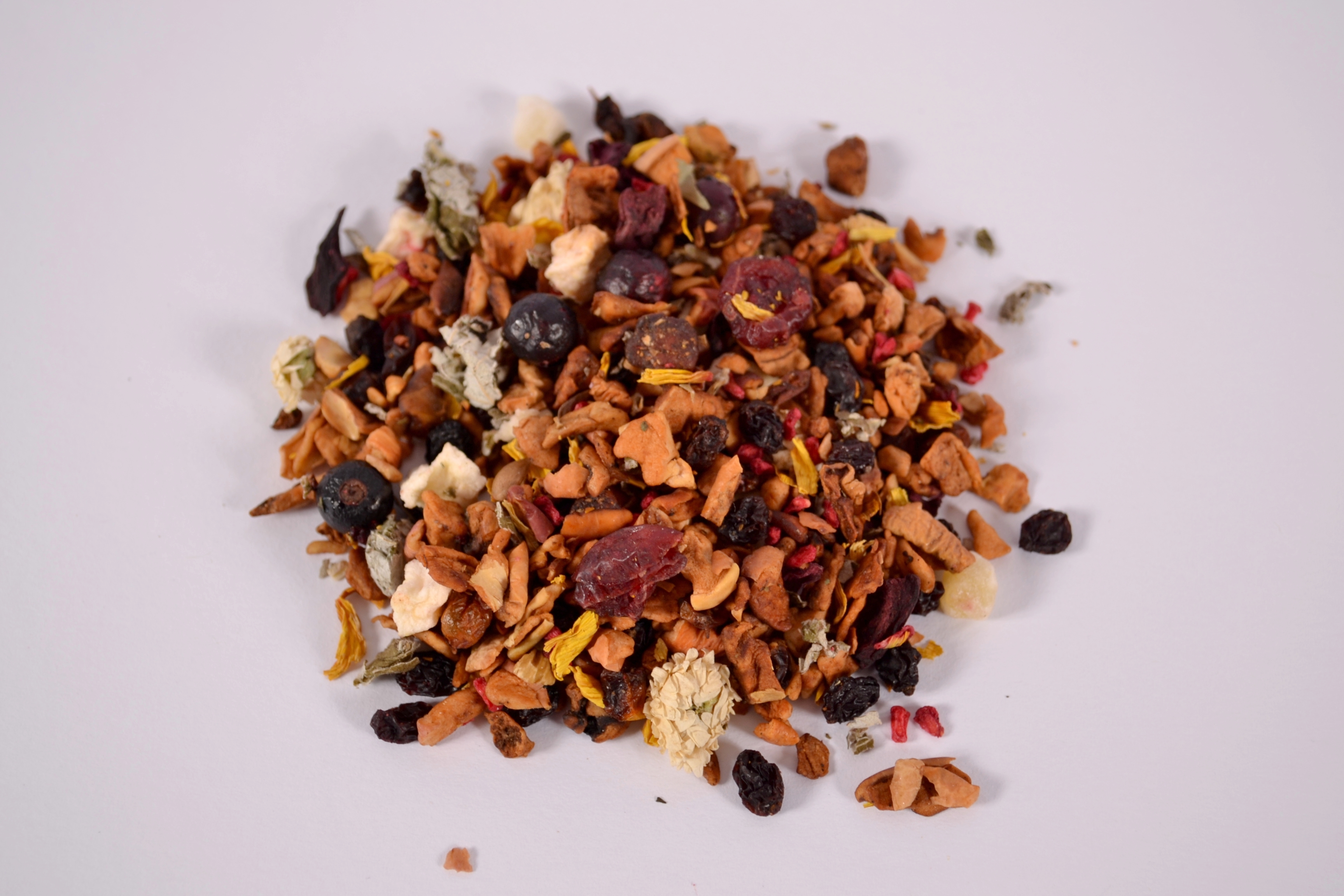 Zloženie: Jablká kúsky, hrozienka, rakytník plody, kľukva plody, broskyne, marhule, červená repa a hrušky kúsky, aróma, čierne ríbezle, listy maliníka, kvety slnečnice, maliny kúsky, chryzantéma kvety.