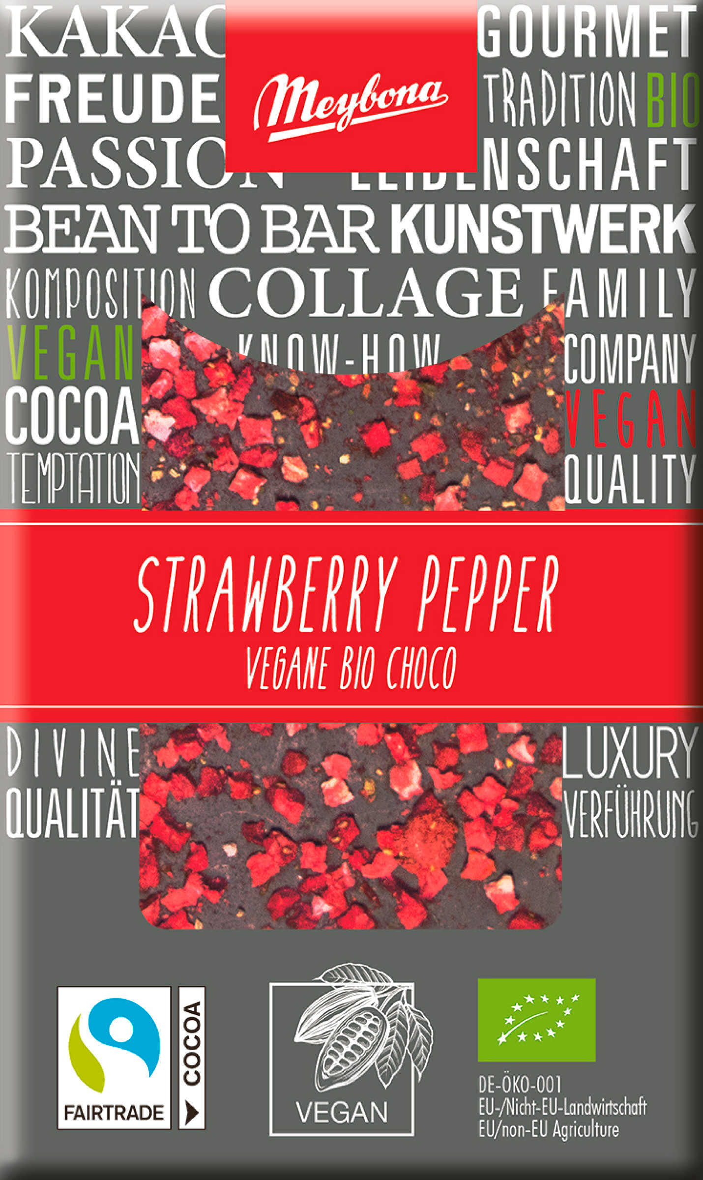 Složení: surový třtinový cukr*, kakaová hmota*, kakaové máslo*, jahody** sušené mrazem (2 %), mletý pepř* (1,5 %) (pepř*, paprika*), jahodový ovocný prášek* (1 %), Bourbon vanilka. Minimální podíl kakaové sušiny: 52 %. * = BIO certifikované suroviny. ** odpovídá cca 6 g čerstvých jahod.