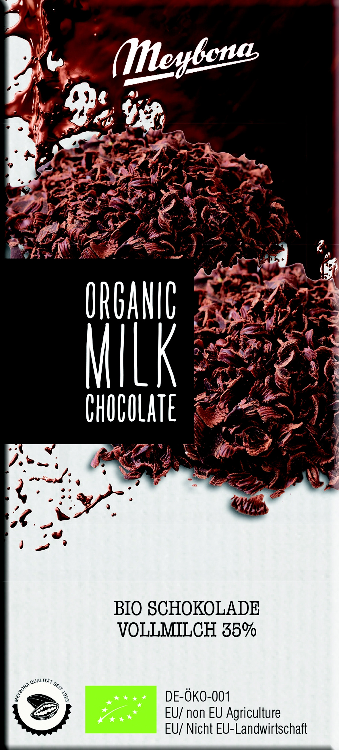 Složení: surový třtinový cukr*, kakaové máslo*, sušené plnotučné mléko v prášku* 23%, kakaová hmota*, vanilka Bourbon*. Minimální podíl kakaové sušiny: 35%. * produkty ekologického zemědělství. Možné stopy: lepek (pšenice), mandle, lískové ořechy. Nutriční hodnoty ve 100g: energetická hodnota 2412 kJ / 579 kcal; tuk 38,9g (z toho nasycené mastné kyseliny 23,5g); sacharidy 48,9g (z toho cukr 48,3g); bílkoviny 7,8g; sůl 0,24g. Uchovejte v suchu při pokojové teplotě, chraňte před teplem. Vyrobeno v Německu.