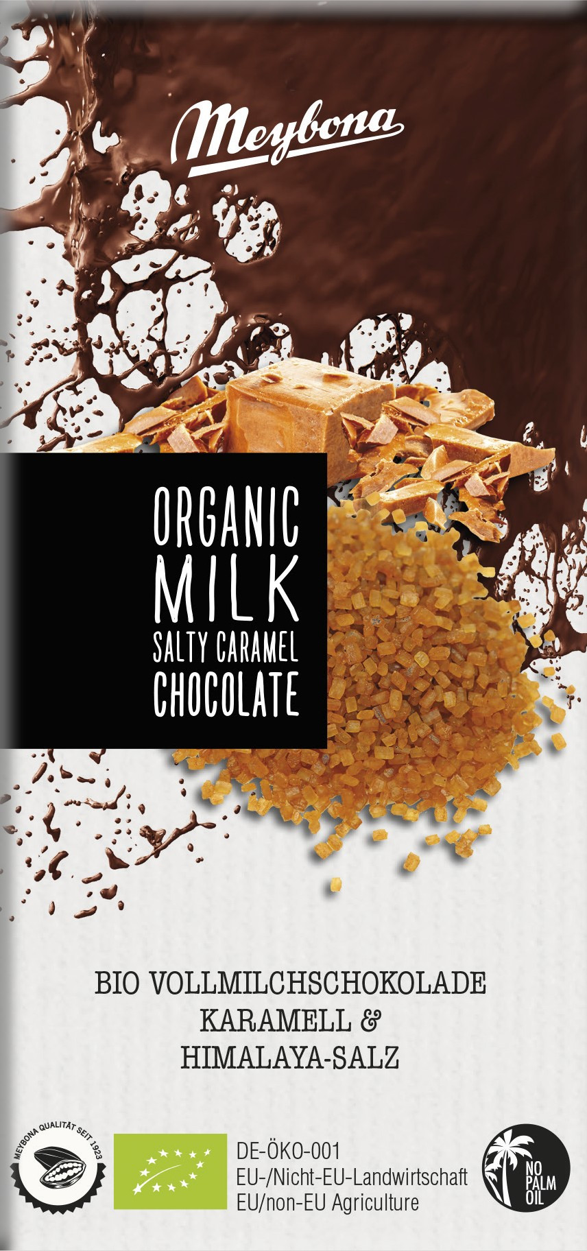 Složení: surový třtinový cukr*, kakaové máslo*, sušené plnotučné mléko v prášku* (23 %), kousky karamelu* (10 %) (cukr*, glukózový sirup*, smetana*, Guérande – sůl), kakaová hmota*, himalájská sůl (0,4 %), Bourbon – vanilka*. Minimální podíl kakaové sušiny: 35 %, mléčné sušiny: 26 %. *Certifikované produkty kontrolovaného ekologického zemědělství. Možné stopy: lepek (pšenice), mandle a lískové ořechy. Nutriční hodnoty ve 100 g: energetická hodnota 2354 kJ / 567 kcal, tuky 36,5g (z toho nasycené mastné kyseliny 22,2g), sacharidy 51,9g (z toho cukr 49,9g), bílkoviny 7,1g, sůl 0,64g. Uchovejte v suchu a chladu. Vyrobeno v Německu.