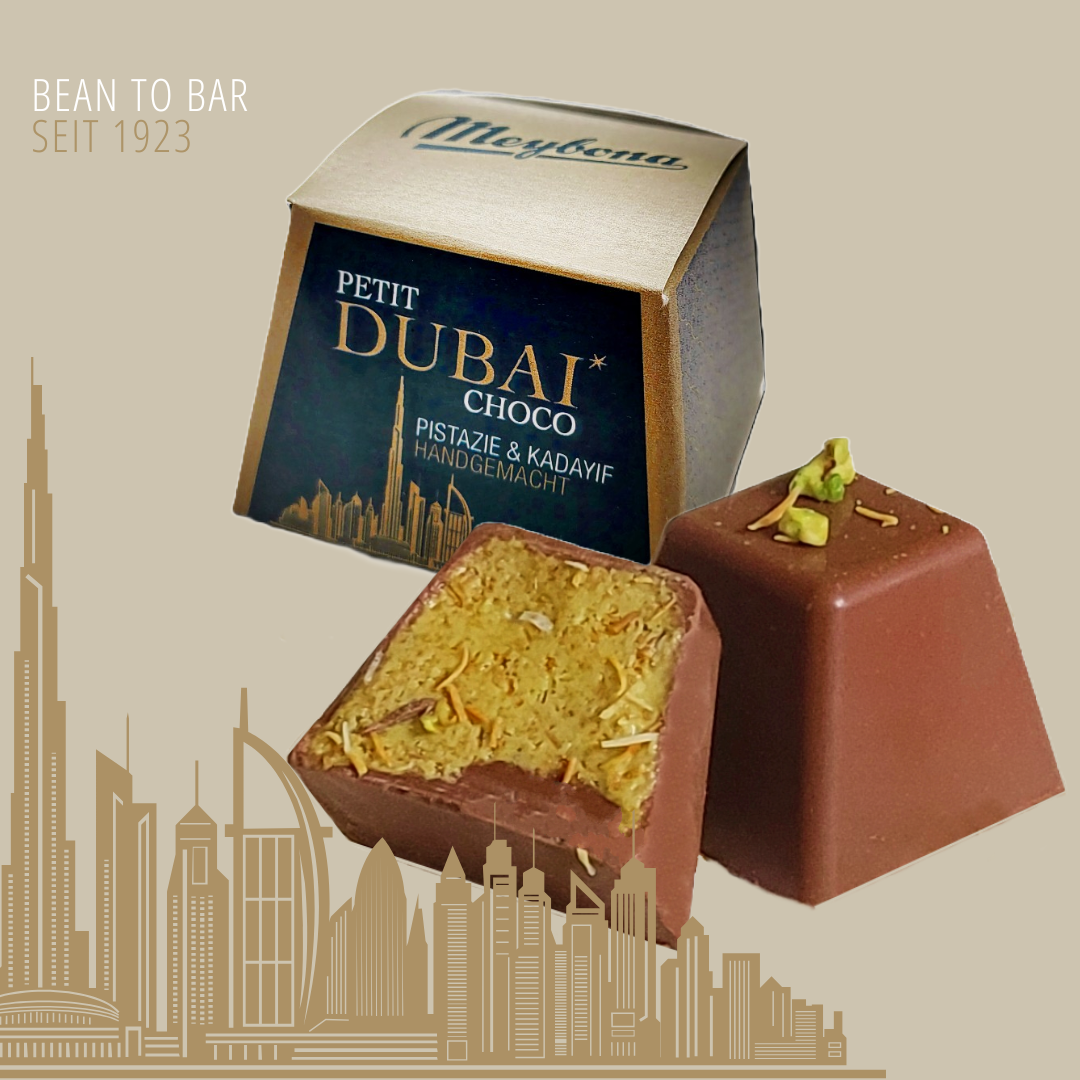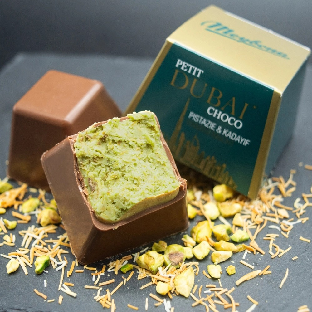 „Maxipralinka“ z mléčné čokolády plněná pistáciovým krémem s Kadayifem.
