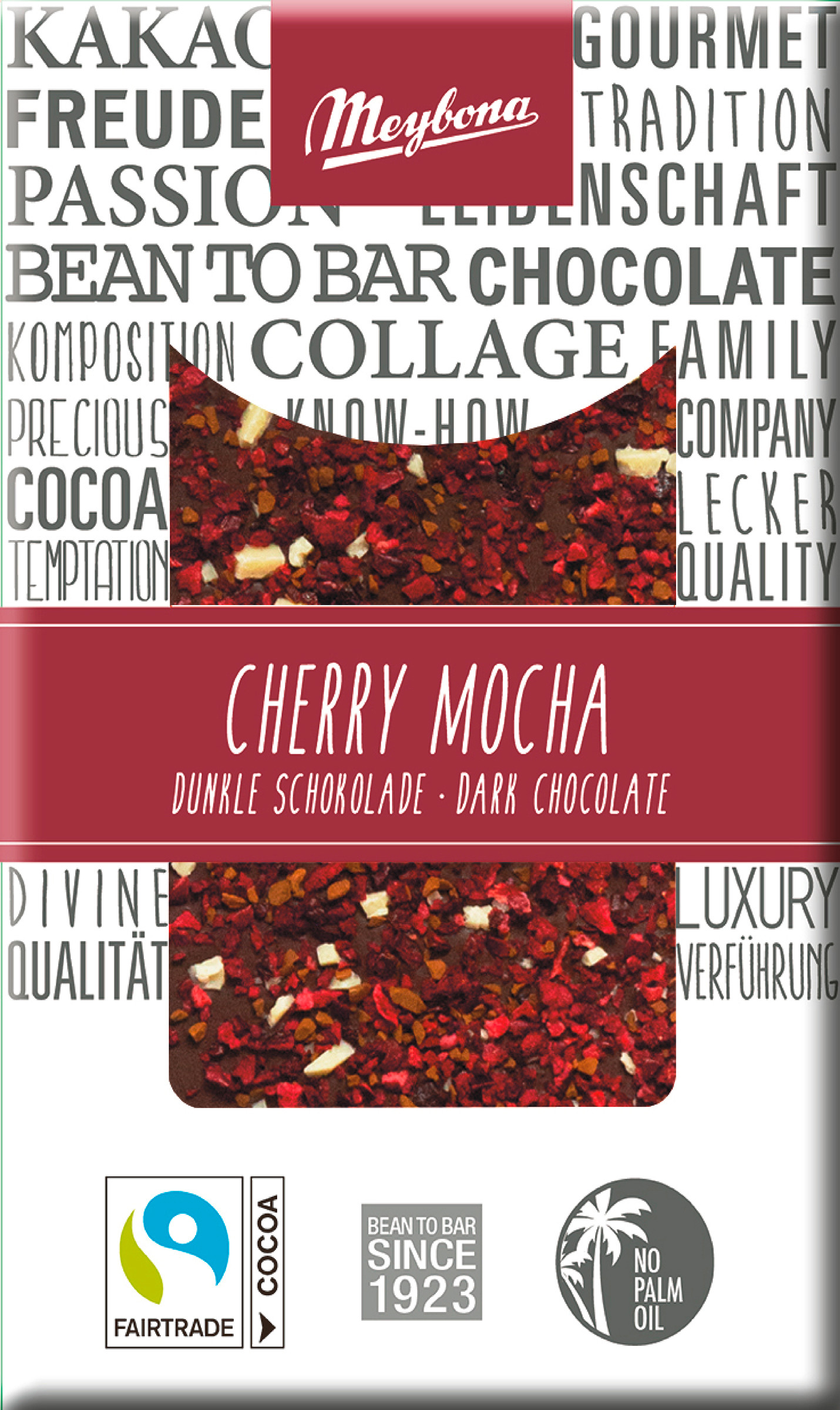 Složení: cukr, kakaová hmota, kakaové máslo, višně sušené mrazem (4 %) *, bílá čokoláda (1 %) (cukr, kakaové máslo, sušené plnotučné MLÉKO sušené odstředěné MLÉKO, emulgátor: lecitin (SÓJA), Bourbon vanilka), káva sušené mrazem (0,5 %), emulgátor: lecitin (SÓJA), Bourbon vanilka. Minimální podíl kakaové sušiny v hořké čokoládě: 50 %. * Odpovídá cca 7,2 g čerstvých višní. Může obsahovat stopy lískových ořechů, mandlí, pistácií a lepku (pšenice). I přes pečlivé třídění mohou zůstat stopy pecek višní.