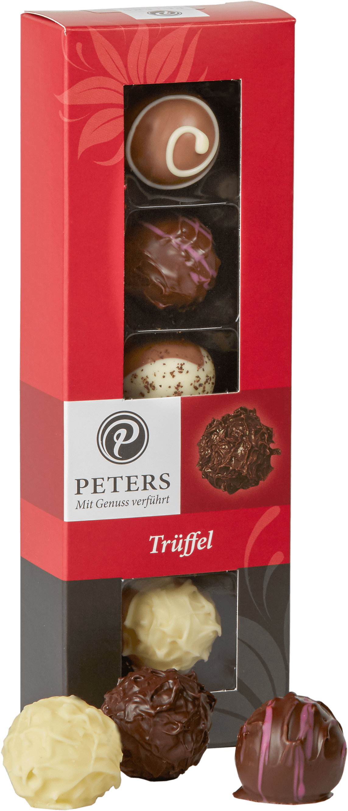 Složení: cukr, kakaové máslo, smetana, kakaová hmota, sušené plnotučné mléko, zvlhčující prostředek: sorbitový sirup; glukózový sirup, vanilkový likér, malinový destilát, Rum, Brandy, Mokka likér, Marc de Champagne, emulgátor: sójový lecitin; alkohol; přírodní vanilkové aroma, invertní cukerný sirup, káva, přírodní malinové aroma, vanilka Bourbon lusk, koncentrát ovocné šťávy: hrozny, červená řepa; sušená smetana, okyselující prostředek: kyselina citrónová; želírující prostředek: Pektin, antioxidant: kyselina Ascorbová; barvivo: červená řepa. Minimální podíl kakaové sušiny v čokoládě: hořké 60 %, mléčné 35 %. Minimální podíl kakaového másla v bílé čokoládě: 18,5 %. Obsahuje alkohol! Není vhodné pro děti. Možné stopy: vejce, lepek, skořápkové plody. Nutriční hodnoty ve 100 g: energetická hodnota1988kJ / 475 kcal, tuky 31g (z toho nasycené mastné kyseliny 19g), sacharidy 42g (z toho cukr 37g), bílkoviny 4,5g, sůl 0,12g. Uchovejte v suchu a chladu, chraňte před slunečním svitem Vyrobeno v Německu. Dovozce: Chocotherapia s.r.o., Loosova 262 / 1, 638 00 Brno.
