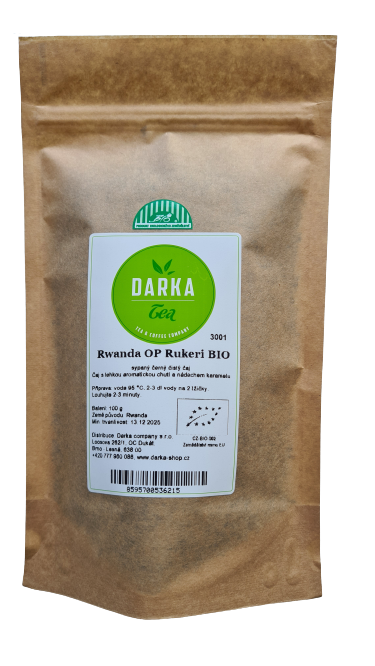 Rwanda OP Ruker BIO je organický čierny sypaný čaj, pestovaný na vulkanickej pôde vysokohorskej organickej záhrady v jedinečnom údolí Ruker v africkej krajine Rwanda. Rwandu charakterizujú úrodná vulkanická pôda, tropické podnebie, dokonalá vlhkosť a zrážky, dlhotrvajúce slnečné dni a zvlnené kopce, ktoré sú na pestovanie čaju veľmi prívetivé.
