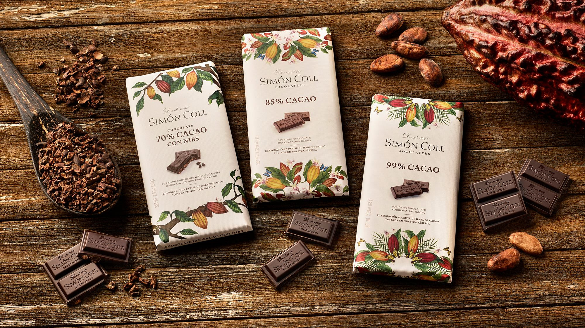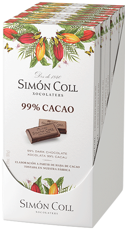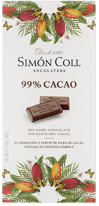 Složení: kakaová hmota, kakaové máslo, cukr. Minimální podíl kakaové sušiny: 99%. Možné stopy: mléko, ořechy, sója. Nutriční hodnoty ve 100g: energetická hodnota: 2526 kJ / 628 kcal, tuky 56g (z toho nasycené mastné kyseliny 36g), sacharidy 11g (z toho cukr 4g), bílkoviny 12g, sůl 0,1g. Uchovejte v suchu a chladu. Vyrobeno ve Španělsku.