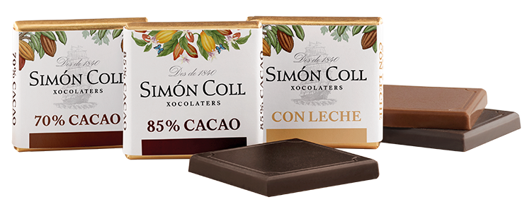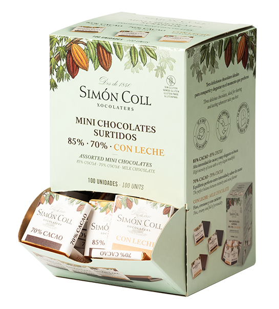 Minitabulky z mléčné a hořké (70 %, 85 %) čokolády. Bez lepku.