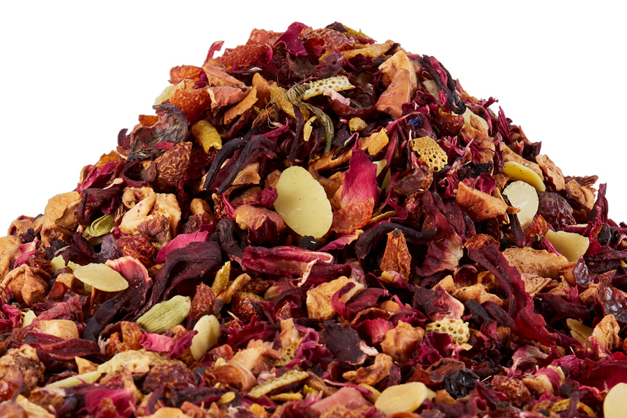 Zloženie: kúsky jabĺk, ibištek, šípky, pomarančová kôra, MANDLE, okvetné lístky ruží, kvety nevädze, klinčeky, semienka kardamómu, extrahovaná bourbonská vanilka, aróma.
