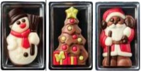 Reliéf z mléčné čokolády Santa, Sněhulák, Stromeček. Dekorovano. Minimální podíl kakaové sušiny: 36%. K prodeji je pouze celé balení, které obsahuje 36ks.